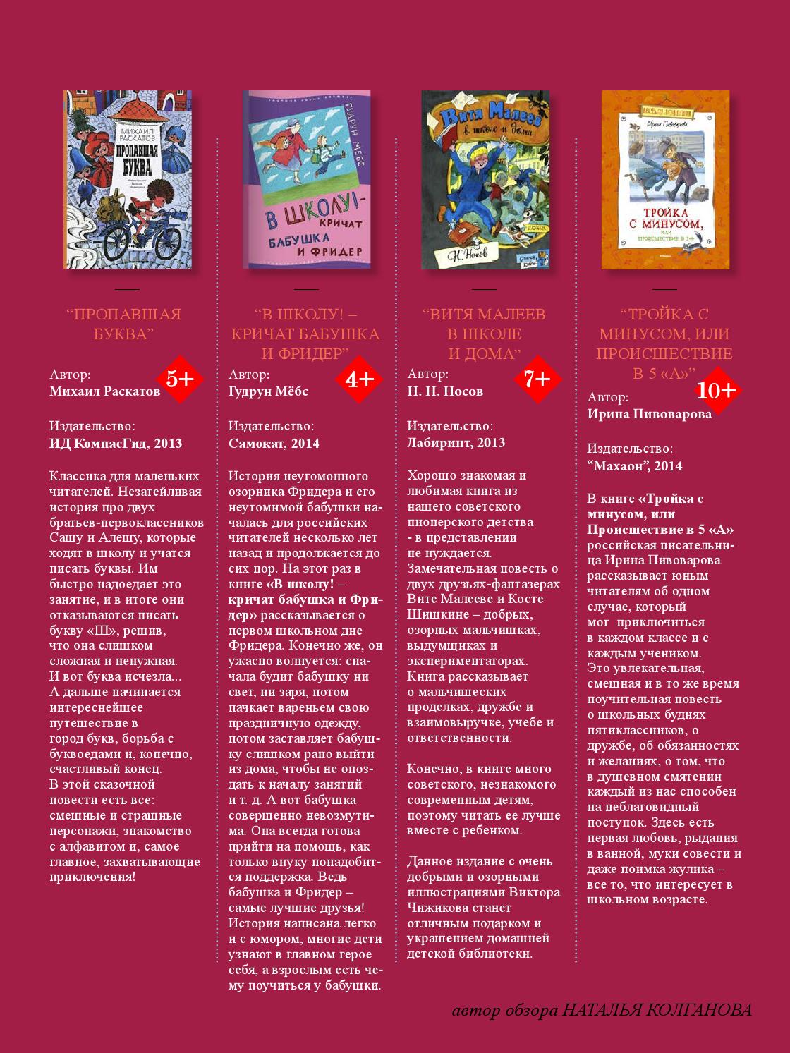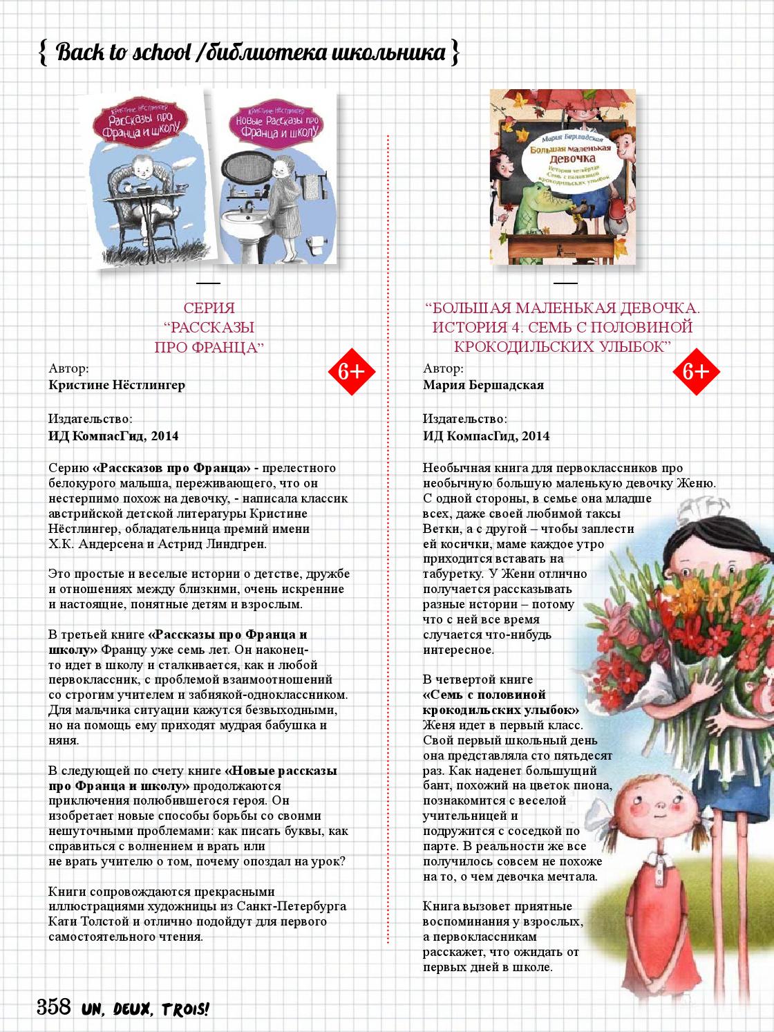 Недавно вышел летний номер замечательного онлайн журнала «Un, deux, trois!» о детях и родителях, о счастливых семьях, о яркой и интересной жизни. Для специального раздела BACK TO SCHOOL! я подготовила обзор книг на школьную тему. С разрешения редакции журнала выкладываю обзор и у себя в блоге. Приятного чтения!